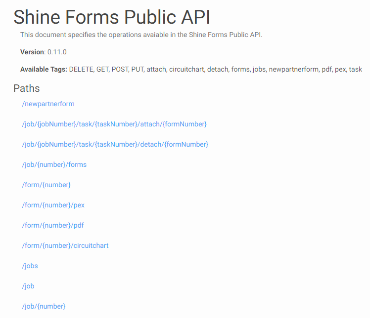 The Shine Forms Public API allows you to automate the creation and management of jobs, tasks and forms. Here is the summary from the API documentation: