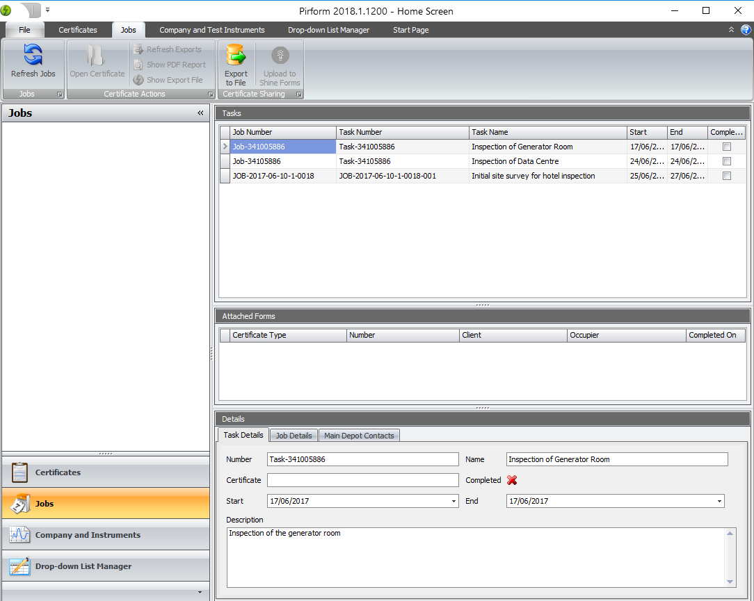 Jobs and forms (such as EICs or EICRs) that are assigned to engineers will automatically appear in their copy of Pirform.