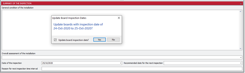 When you change the inspection date, Pirform used to automatically update the inspection date for any boards whose date matches the old date. If you’re working on a certificate for a rolling program of inspections then you won’t want to update your boards automatically. So, we’ve now made the updating optional.