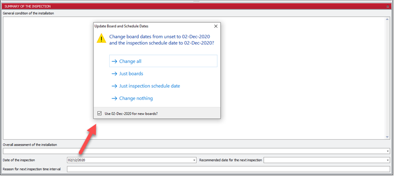Pirform ask whether you want to update the inspection dates for boards that match the previous date before making any changes. You can also optionally update the inspection schedule date and the board date for the certificate: