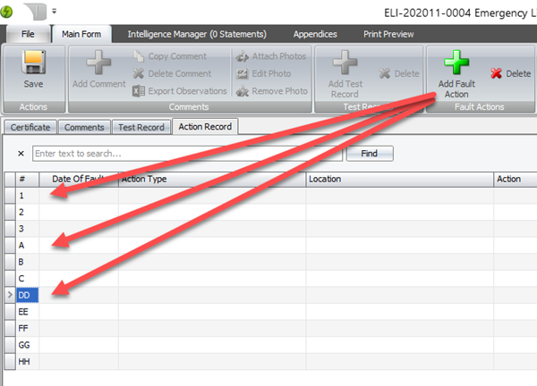 You can now change the numbering of elergency lighting fault action records from the default numeric to whatever you want. If you change to a letter or double letters, then Pirform will automatically add the next line number for you.