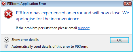 Pirform will then shut down. Notice that you have the option to automatically send details of the errors to us. If you do not want to send details of the error to us then uncheck the box.