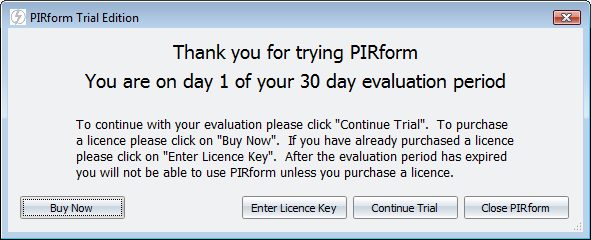 When you first install and run Pirform you will see this licence entry screen: