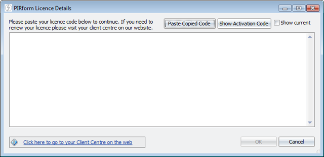 If you have an internet connection then Pirform can do that for you over the internet. If you do not have an internet connection then you can can get an activation code from your Client Centre on our website. When Pirform needs to be activated you will see this after you open Pirform: