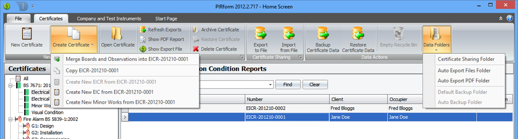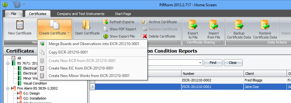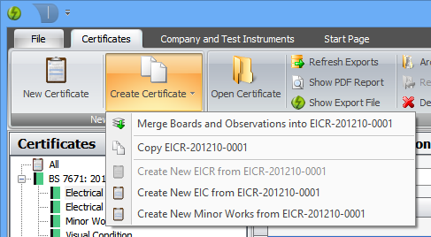 We’ve added more ways to create one certificate from another. You can now create a Minor Works and Electrical Installation Condition Reports from any Electrical Installation and Visual Condition Certificates (2008 and 2011). To access these features, select the certificate you want to copy or create another type of certificate from, then click the Create Certificate button in the ribbon: