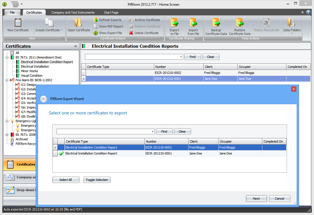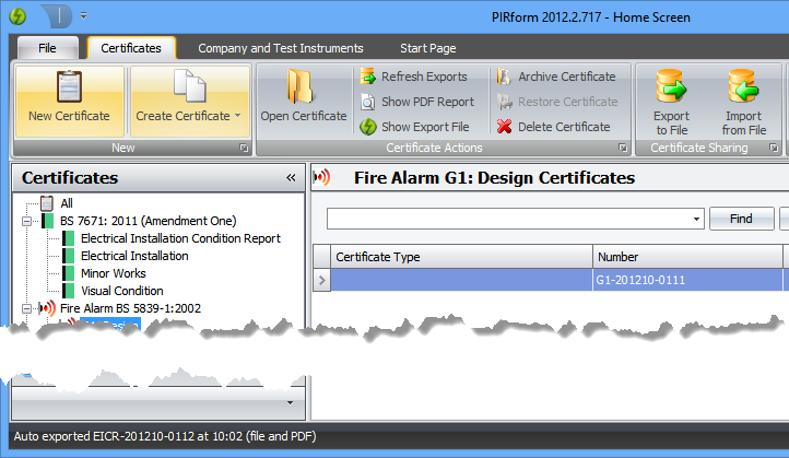 If you make any changes to a certificate, then when you close it the program will automatically save an export file containing the latest version of the certificate along with a PDF of the certificate. These are saved to folders of your choice, the default being a folder under your Documents folder. Pirform tells you when it auto-exports a file at the bottom left of the Home Screen: