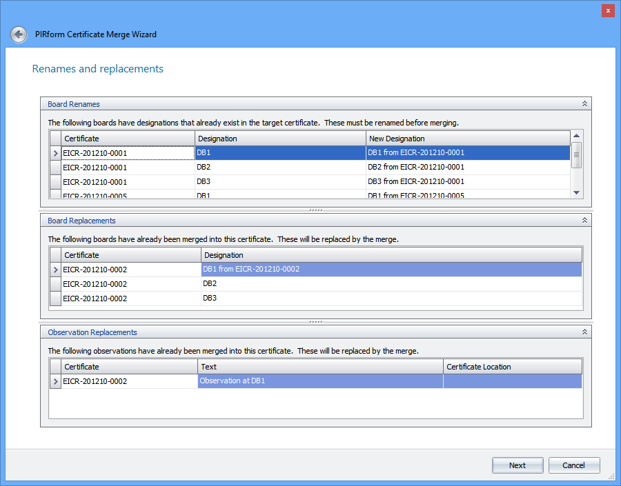 When you click next, Pirform looks at the boards that you are going to merge and makes sure that board designations will be unique after the merge. Pirform also remembers boards and observations that were previously merged and replaces the board or observation if you merge the