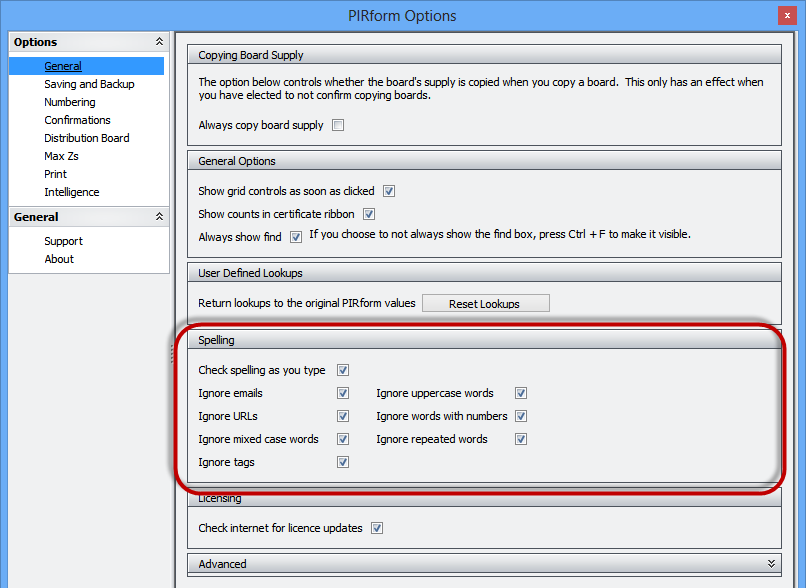 Pirform has a built-in spell checker that helps to make sure all your reports and certificates are correct and professional. We’ve added a number options to help you control the way the spelling checker works. Just open Pirform Options and go to the General section: