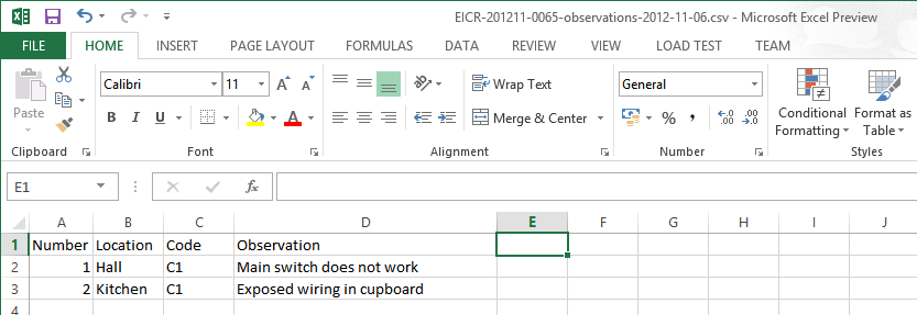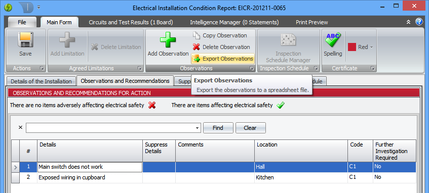 You can now export all the observations in a certificate to a spreadsheet. This gives you access to the observations for things like preparing a schedule of works or to use when costing remedial works. Just click the button marked Export Observations in the ribbon: