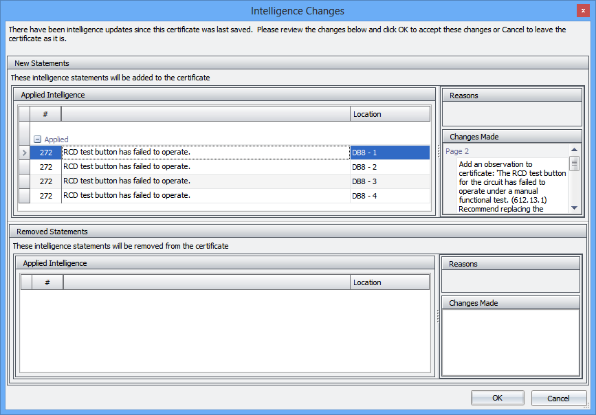 If the intelligence is updated between version of the program, then it may happen that either new intelligence applies to a certificate or intelligence that used to apply no longer applies. When you open a certificate, Pirform now checks to see if there are any intelligence statements that are added or removed and if there are it will show you a summary of the changes.