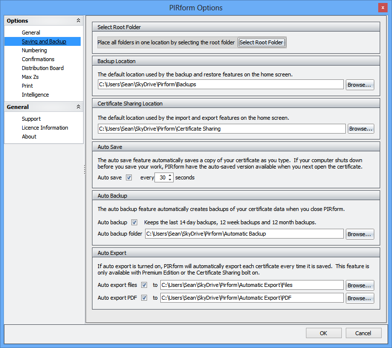 You can now move your your backup and export folders to be under a single root folder in one go. This makes it easier to set up Pirform to use cloud services like Dropbox or SkyDrive with Pirform for free online certificate storage or for free online based certificate sharing.